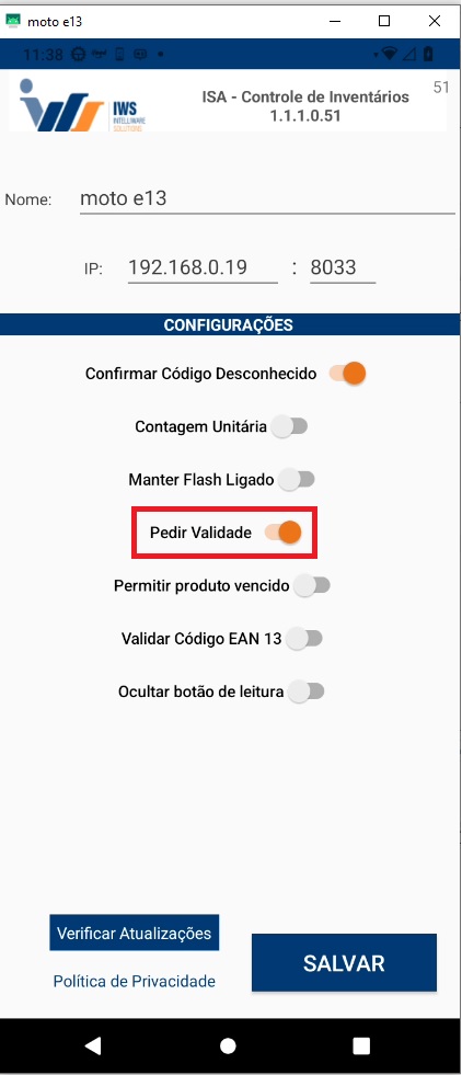 Nas configurações de conexão há dois campos, um para o IP da máquina onde o servidor do ISA está instalado e outro para a PORTA, que por padrão é a 8033, por onde o servidor receberá as requisições do APP.
