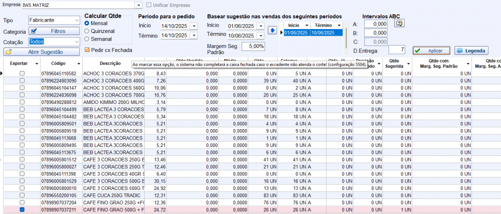 Qtde Com Margem +5%:Mostra a quantidade sugerida para a compra do produto com a margem de segurança padrão (5%);