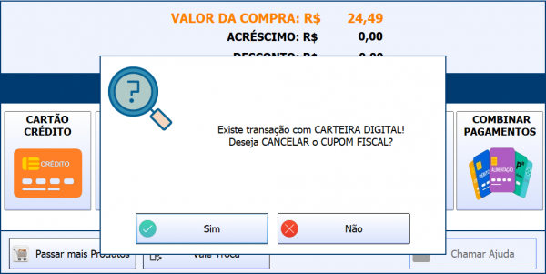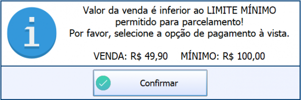 Caso o valor da venda não atinja o valor mínimo para parcelamento, será exibida a seguinte mensagem para o usuário: