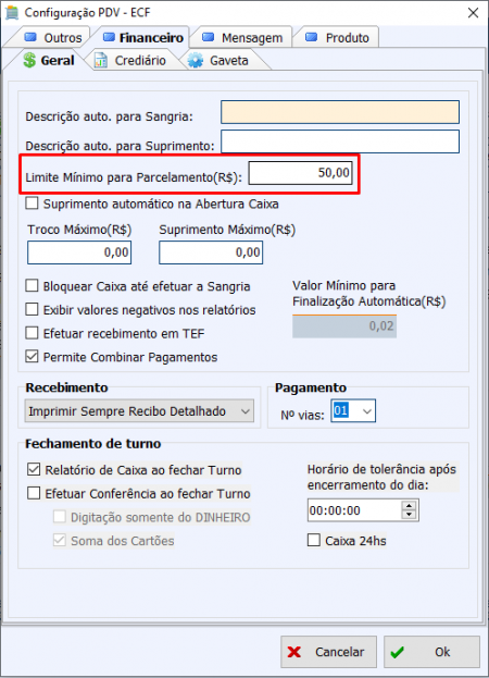 Pode-se estabelecer também um limite mínimo para o parcelamento, segue a imagem:
