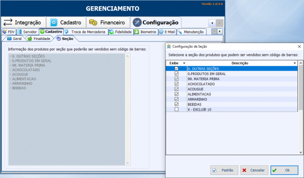 Na tela de configurações, criou-se mais uma aba para cadastro das seções que serão listadas no filtro na tela de venda de produtos sem código de barras: