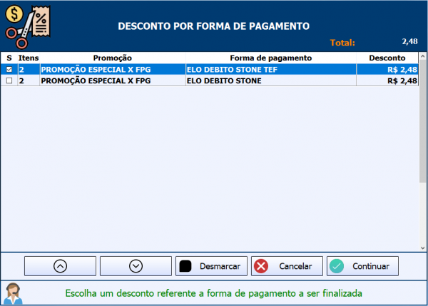 As promoções por forma de pagamento oriundas da Scantech possuem uma descrição própria da forma de pagamento, o que impossibilita a correspondência com as formas de pagamento do sistema. Como paliativo foi alterado para validar pela nomenclatura Crédito e Débito. Foi realizado o tratamento para validar todas as formas de pagamento de forma correta, para cartão utilizou-se os BINs. Foi implementado um tratamento para desabilitar automaticamente os botões de pagamento que não correspondem à promoção vinculada à forma de pagamento. No caso de a configuração Combinação de Pagamento estar ativada, ela não terá prioridade sobre esse tratamento, ou seja, enquanto houver uma promoção aplicada, apenas as formas de pagamento compatíveis com a promoção permanecerão habilitadas. A opção de Combinação de Pagamento só estará disponível quando não houver uma promoção selecionada, garantindo que a regra promocional prevaleça. Segue: