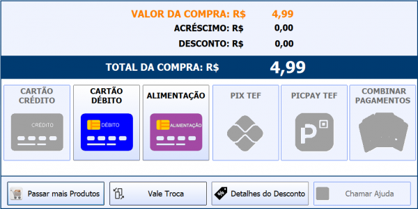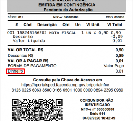 No segundo cenário, ao realizar a compra com o valor de R$ 0,01, nenhum QR Code é gerado, indicando que a compra é finalizada automaticamente: