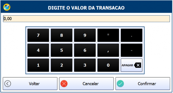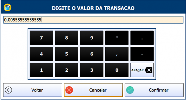 Durante os testes do Self - FOOD foi detectado a seguinte situação: Ao chamar o cancelamento de uma venda no momento que é apresentado a tela Digite o valor da transação, o campo valor é apresentado da seguinte forma: