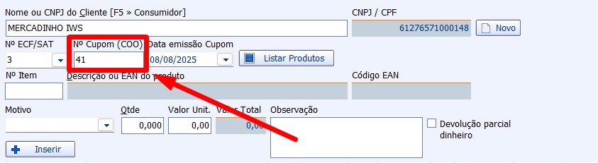 5º Passo – No campo “Nº Cupom (COO)”, deve-se inserir o número correspondente ao cupom fiscal da venda original, Conforme imagem abaixo: