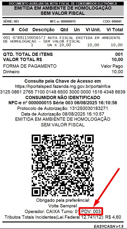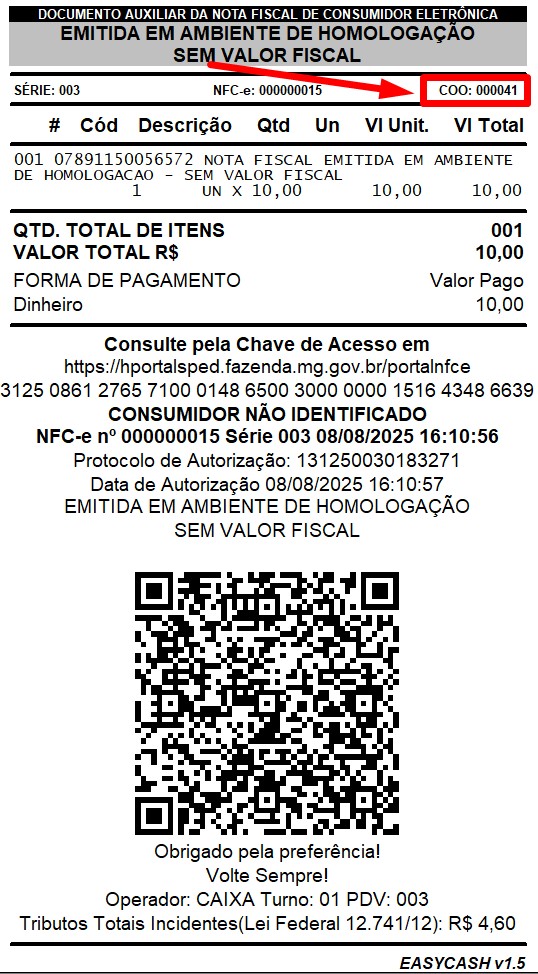 Em caso de dúvida, essa informação pode ser verificada no canto superior direito do cupom fiscal, onde estão localizados os dados da transação, conforme imagem abaixo: