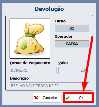 Automaticamente, o sistema retornará para a tela “Devolução”, já preenchida com os dados referentes à devolução do dinheiro. Confirme as informações e clique no botão “Ok”, conforme ilustrado na imagem abaixo.