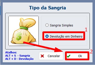 Será exibida a tela “Tipo da Sangria”. Nesse momento, selecione a opção “Devolução em Dinheiro” e clique no botão “Ok”, conforme imagem abaixo.