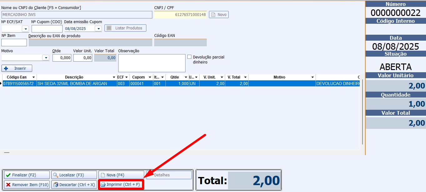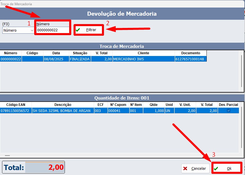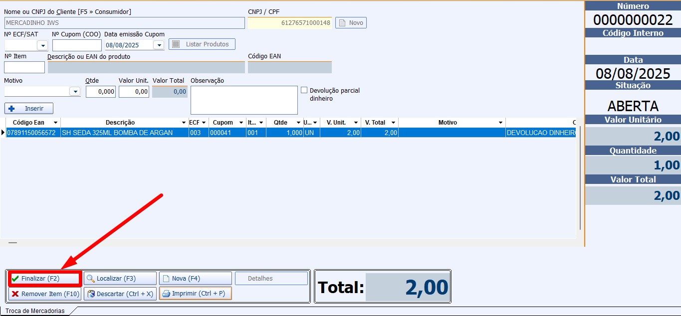 7º Passo – Para concluir o processo de “Troca de Mercadoria”, confira todas as informações inseridas. Após a verificação, clique no botão “Finalizar (F2)”, conforme imagem abaixo.