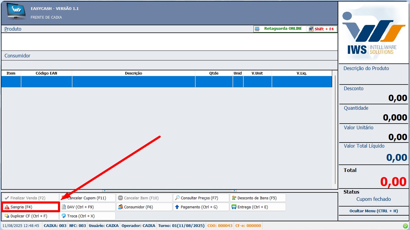 1º Passo – No sistema Easycash, clique no botão “Sangria (F4)”, conforme ilustrado na imagem abaixo.