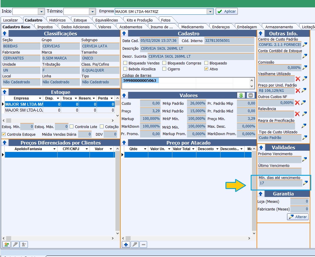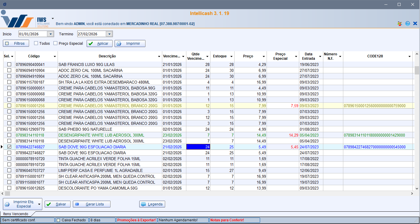 Será permitido atualizar preços com desconto especial em massa pela tela de relatórios (Menu > Relatórios > Cadastros > Produtos > Itens com Validades vencendo). No caso das etiquetas com preço especial, serão emitidas o númeo de etiquetas correspondente a quantidade de produto na validade selecionada.