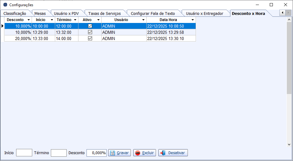 Essa funcionalidade permite definir faixas de horário em que todos os itens inseridos na comanda receberão desconto conforme a taxa configurada para aquele período. O desconto será aplicado somente no momento da inclusão do item, considerando o horário atual, e não se aplica em item Couvert, que sempre será desconsiderado dessa regra. As taxas configuradas não podem ser negativas e não é permitido cadastrar dois períodos com o mesmo intervalo de horário.