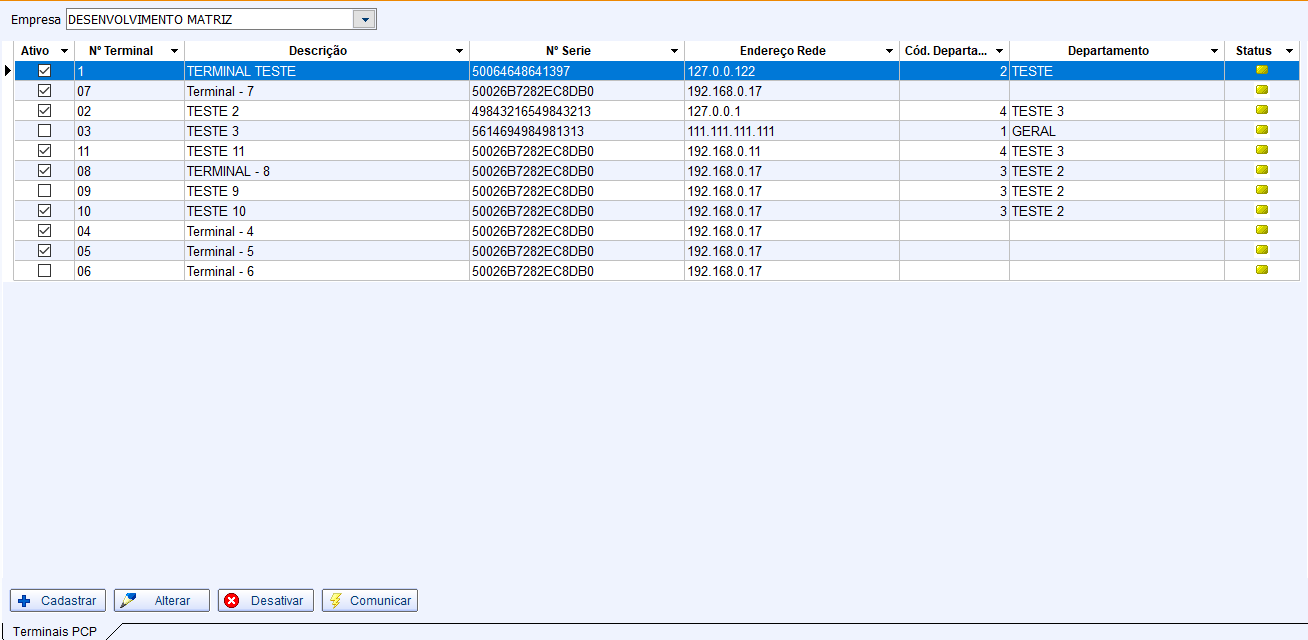 Na inteface, será exibido os dados dos terminais cadastrados, separados por empresa, e também será possível cadastrar novos, alterar cadastros existentes, desativar e ativar terminais, e verificar a comunicação com os mesmos.