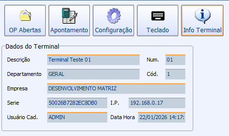 Ao abrir pela primeira vez, se não houver nenhum cadastro de terminal com as mesmas informações de endereço de rede, serie, empresa e numero do terminal, o cadastro será realizado automaticamente com a descrição padrao 'Terminal - (numero do terminal)', que pode ser alterada pelo cadastro do intellicash, serie e endereço de rede da maquina, e a empresa.