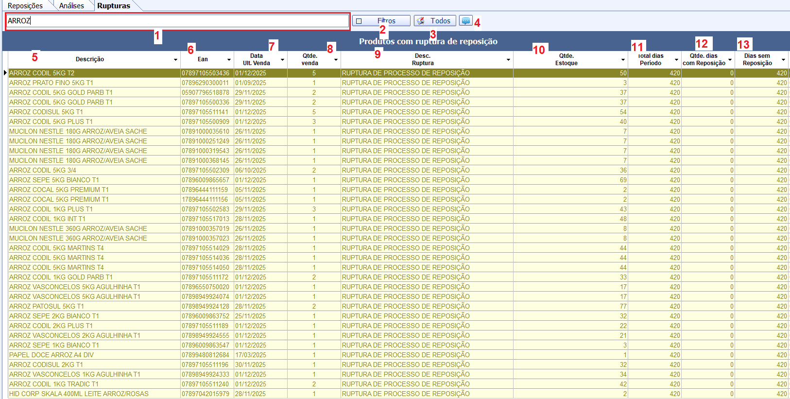 Exibe produtos que se enquadram como ruptura no período: