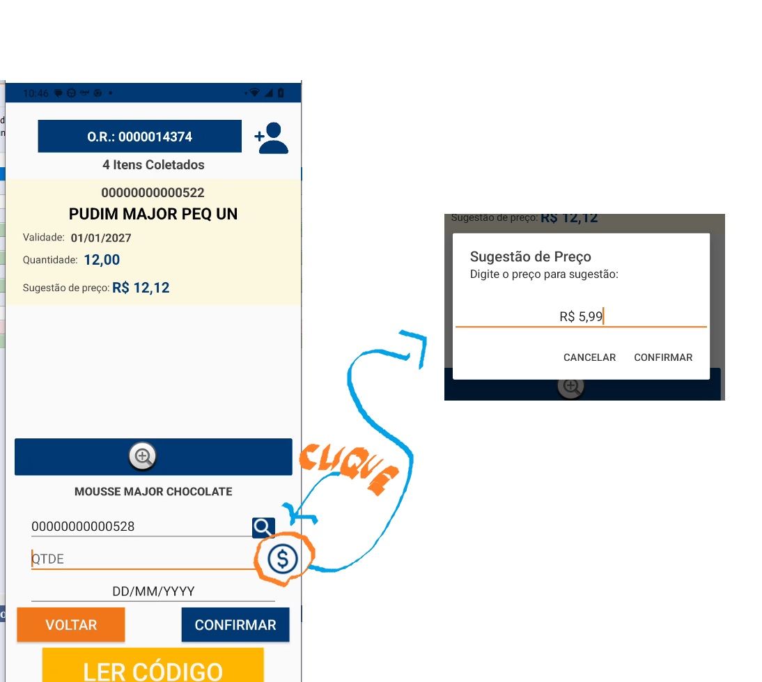 Após essa configuração, ao ler um produto válido o botão de sugestão de preço aparecerá ao lado do campo QTDE. Ao clicar no botão de sugestão de preço uma janela irá aparecer. Basta adicionar o valor desejado.