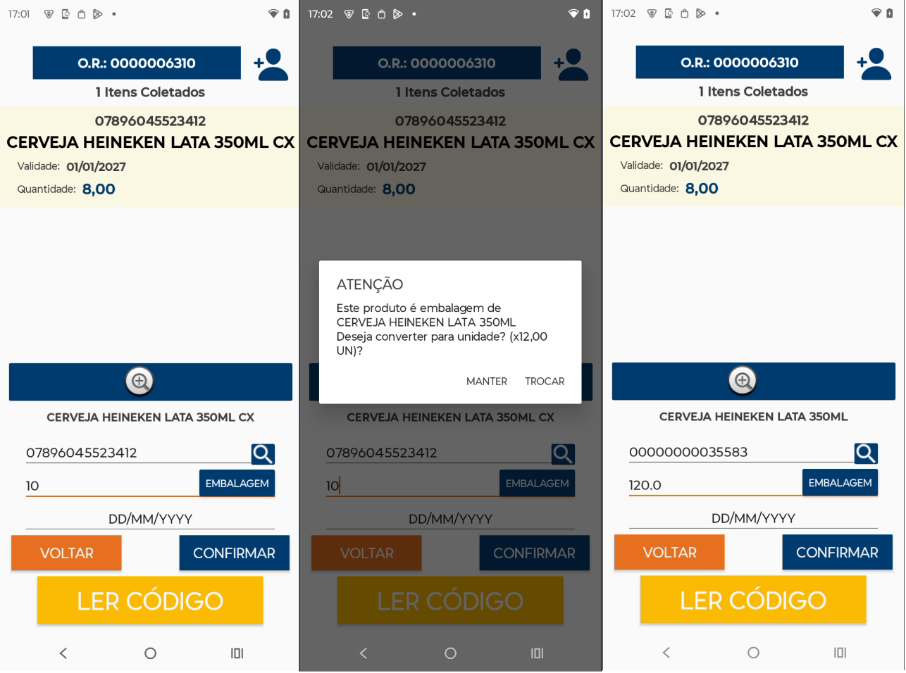 Ao inicar a coleta desejada, caso a configuração Pedir Validade esteja selecionada, aparecerá o campo Validade. Caso contrário, o campo validade não aparecerá.