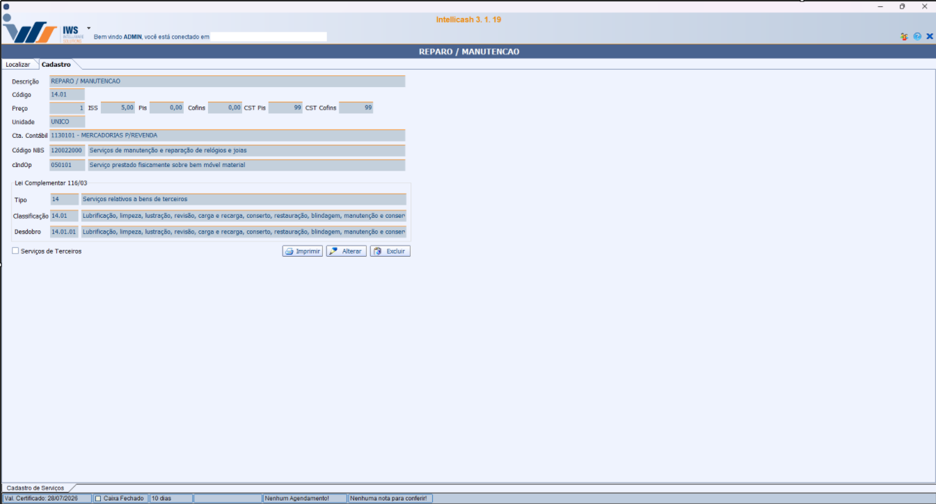 Imprimir para imprimir o cadastro do Serviço selecionado;