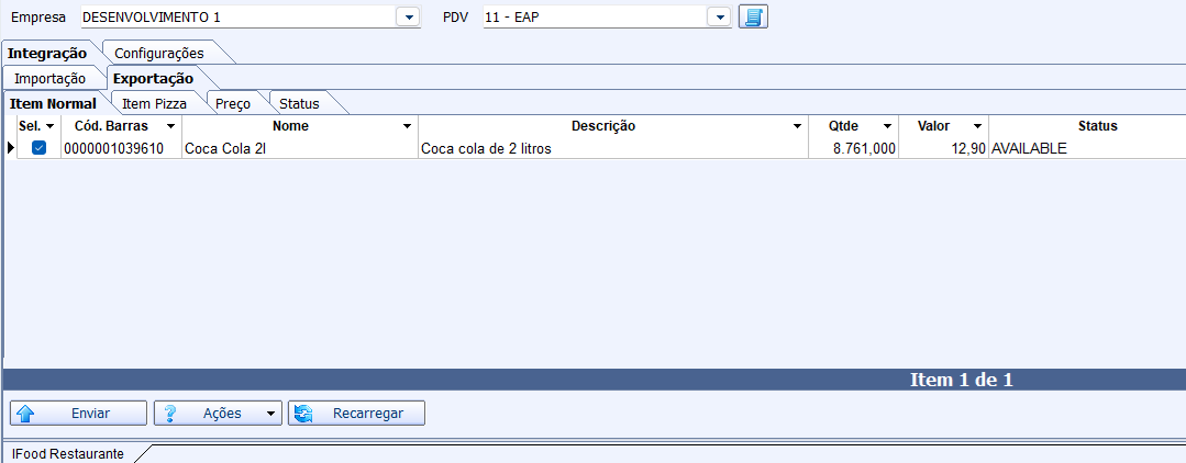 A aba de exportação permite cadastrar e atualizar itens na plataforma do IFood.