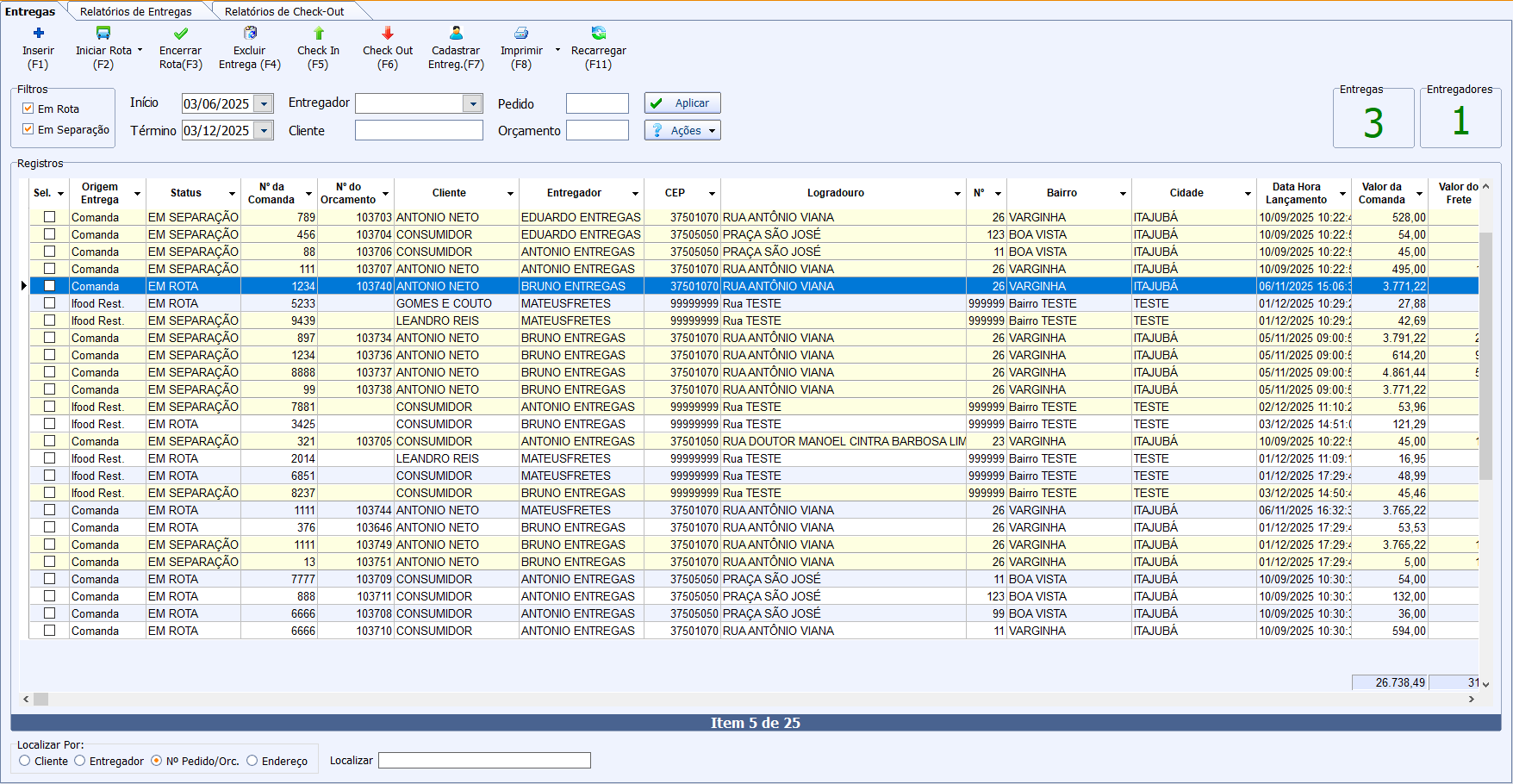 A Inserção Automática permite que as entregas sejam geradas diretamente pelas telas de origem do pedido, sempre com o status inicial “Em Separação”. Dessa forma, o sistema dispensa todo o processo de inserção manual, tornando a operação mais rápida e eficiente. Após a geração automática, o usuário deverá apenas iniciar e encerrar a rota normalmente pela tela de Gestão de Entregas.